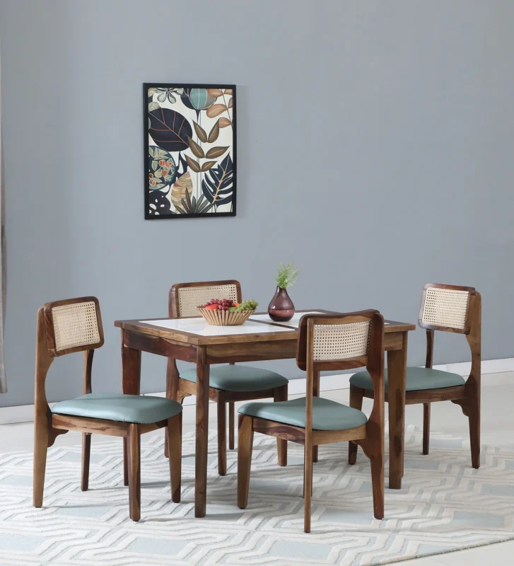 Boston Solid Wood Rattan Cane Dining Table Four Seater Set – Brown Finish