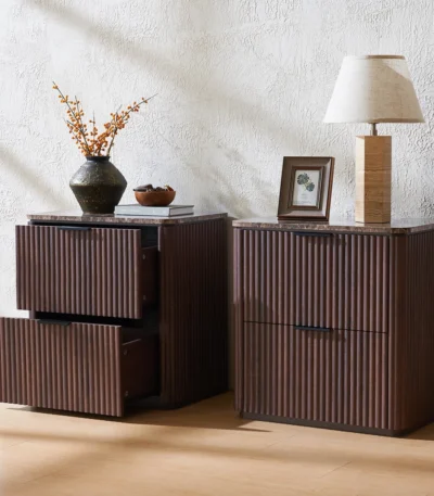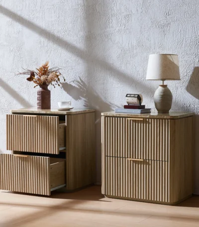 Nightstand Set of 2, 3-Sided Fluted Wood Bedside Table with 2 Drawers and Faux Marble Top (Set of 2)